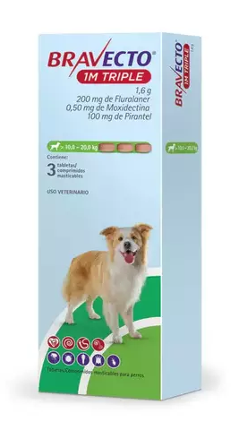 BRAVECTO 1 Mes Triple c/3 TAB (10 a 20 KG) de 200 mg es el primer producto mensual contra parásitosexternos e internos en el portafolio de Bravecto®